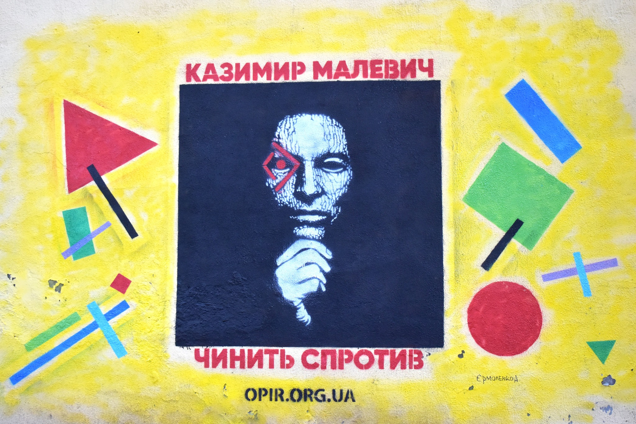 На іншому муралі під назвою «Малевич чинить опір» зображено «Чорний квадрат», у центрі якого символічна маска Руху опору, а навколо - елементи супрематичних елементів з картин Казимира Малевича, який проживав у Конотопі з 1894 по 1897 рік разом з батьками. Стінопис є символічним, адже Україна відстояла право називати засновника супрематизму та фундатора кубофутуризму українським художником. Схожий стінопис є і в Білопіллі, де певний час мешкала родина Малевичів.