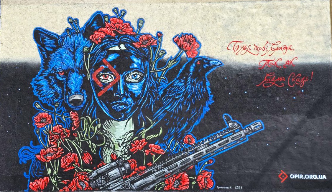 На одному зі стінописів – жінка – конотопська відьма, на обличчі якої маска зі знаком «Рух опору», з вовком і круком. «Цей мурал називається «Конотопська відьма». В руках у жінки зброя – це означає, що в рух опору можуть записатися навіть відьми, Україна озброєна та чинить спротив. Крук – символ підпілля, яке працює за лінією фронту, вовк – символ Сил спеціальних операцій ЗСУ, маки символізують наших загиблих воїнів», - зазначає Андрій Єрмоленко.