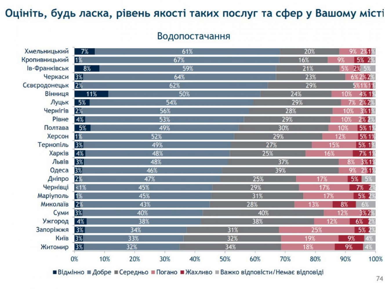Найкраще з водою в Хмельницькому (7% - 61% - 20% - 9% - 2%), Кропивницькому (1% - 67% - 16% - 9% - 5%) та Івано-Франківську (8% - 59% - 21% - 5% - 2%).
