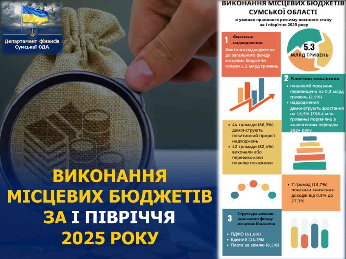 Про виконання місцевих бюджетів Сумської області в умовах правового режиму воєнного стану за І півріччя 2025 року повідомляє Департамент фінансів Сумської обласної державної адміністрації.