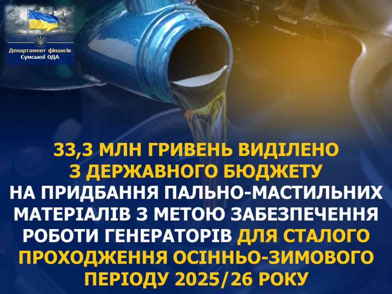 Для довідки: Раніше, 29 жовтня 2025 року, Кабінет Міністрів України вже виділив Сумській області 27,5 млн гривень з резервного фонду держбюджету на придбання ПММ для сталого функціонування систем життєзабезпечення населення в осінньо-зимовий період (розпорядження № 1174-р).