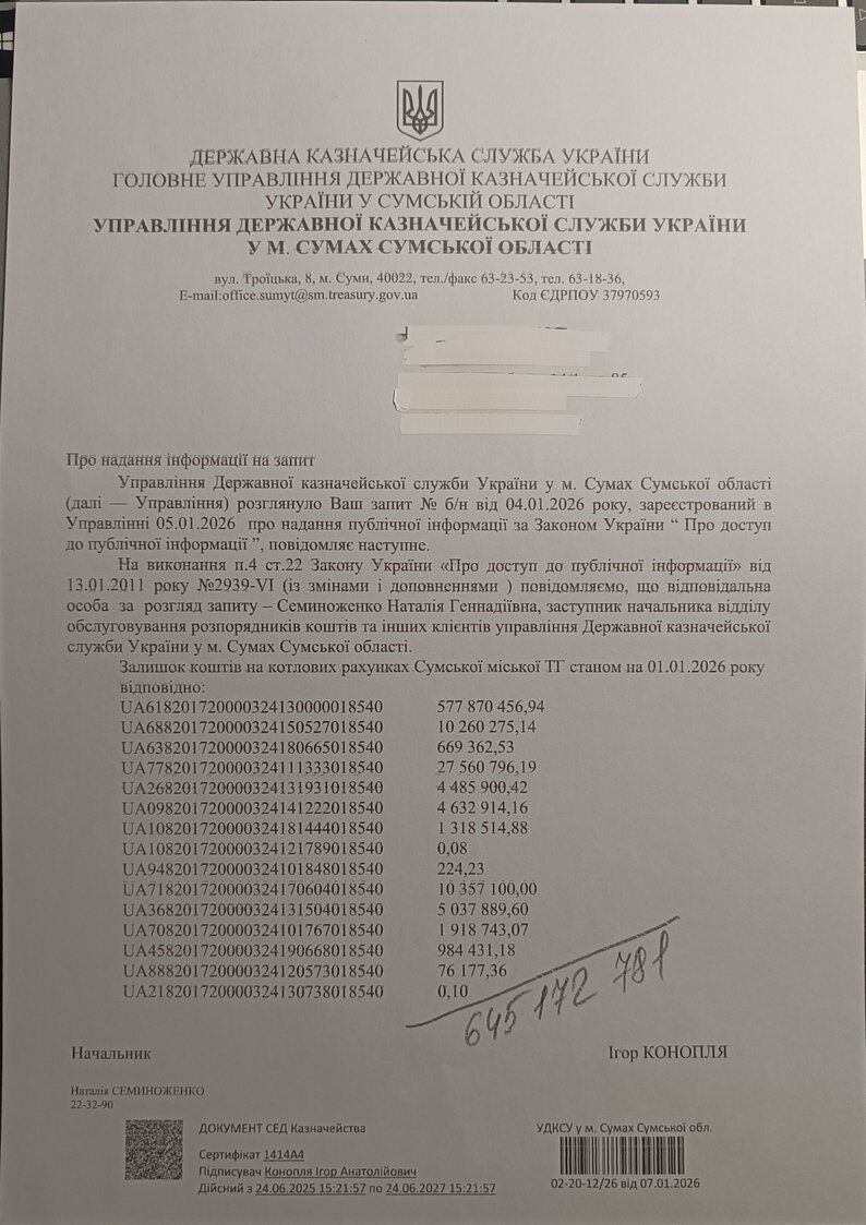Ці дані стали відомі у відповідь на офіційний запит голови ГО «Добро перемагає», яку він очолює, до управління Державної казначейської служби України у місті Суми. Отримані цифри свідчать про наявність значного фінансового ресурсу, який може бути спрямований на потреби громади у поточному році.