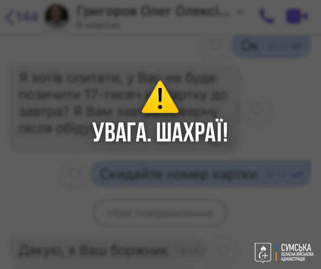 Начальник Сумської обласної військової адміністрації Олег Григоров попередив мешканців області про активізацію шахраїв. Зловмисники розсилають повідомлення в месенджерах, видаючи себе за нього.
