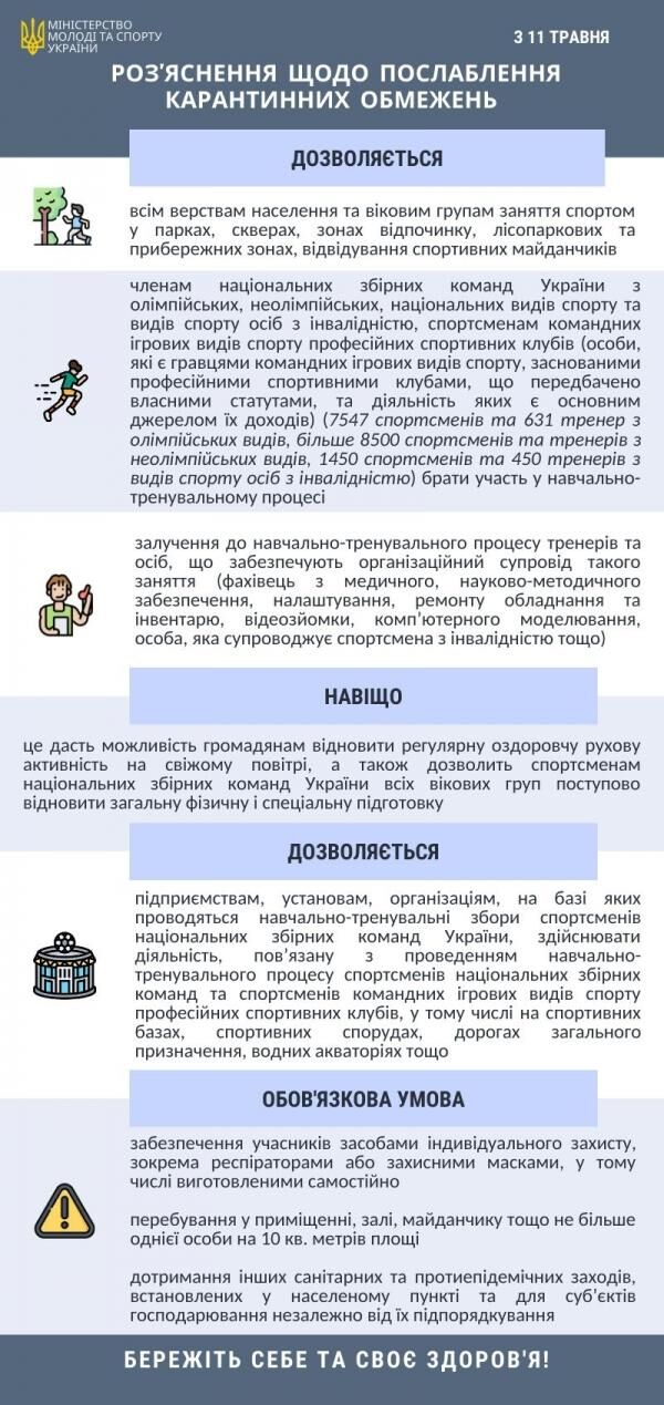 Відповідно до постанови Кабінету Міністрів № 343 з 11 травня дозволено навчально-тренувальний процес національних збірних команд України з олімпійських, неолімпійських, національних видів спорту та видів спорту осіб з інвалідністю. Поновлюється робота закладів, які забезпечать цей процес.